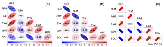 Correlations between climatic factors and glacier area in the PP section of the CPEC before and after the project initiation. Figures (a,b) depict the correlations before and after 2015, respectively, while Figure (c) shows the trends in these correlations (red arrows indicate strengthening correlations, and blue arrows indicate weakening correlations). GLA, TEM, PRE, EVA, WIN, and SOL represent glacier area, temperature, precipitation, evapotranspiration, wind speed, and solar radiation, respectively.