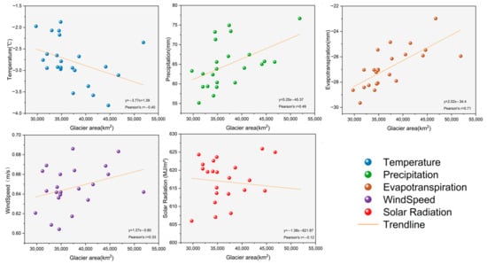 For a more quantitative assessment, Figure 8 presents the results of linear regression analyses between glacier area and key climatic factors. The derived regression equations robustly illustrate both the magnitude and direction of these relationships. Notably, the negative coefficients for temperature indicate that increasing temperatures are strongly associated with reductions in glacier area, whereas the positive coefficients for evapotranspiration underscore its considerable influence on glacier dynamics. Overall, these regression models not only validate our correlation analysis but also quantitatively delineate the sensitivity of glacier retreat to climatic variations, thereby enhancing our understanding of the underlying driving mechanisms.