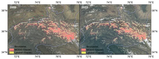 This study utilized Landsat 5 and Landsat 8 data in combination with the NDSI and threshold extraction methods to obtain glacier area estimates for the PP section of the CPEC in 2000 and 2022. These estimates were compared with those derived from MODIS data for the corresponding years to evaluate the accuracy of MODIS-based glacier area extraction. The results indicate that there are notable differences between MODIS and Landsat in glacier area extraction. In particular, the glacier areas derived from MODIS data were generally higher than those from Landsat data in both 2000 and 2022, resulting in relatively large relative errors. According to the comparison results (Table 2), in 2000 the glacier area extracted from MODIS was 33.06 × 103 km2, whereas the area from Landsat data was 24.43 × 103 km2, corresponding to a relative error of 35.31%. By 2022, the glacier area from MODIS was 29.03 × 103 km2, compared to 21.66 × 103 km2 from Landsat data, yielding a relative error of 34.01%.These findings suggest that although Landsat data, with its higher spatial resolution (30 m), can provide more detailed glacier boundary information, its excessively fine resolution does not offer a clear advantage in large-scale glacier area estimation and may even amplify local errors [64]. In contrast, MODIS data—with its lower spatial resolution (250 m to 1 km)—can effectively estimate glacier area over larger regions, particularly in high-elevation areas where it provides more consistent and broadly covered glacier distribution data, thereby conferring a distinct advantage in large-scale glacier monitoring [65]. In terms of spatial distribution (Figure 9), glacier maps generated from MODIS data are more widespread and uniform, accurately reflecting glacier distribution trends across large areas. Conversely, Landsat data, which focuses on finer local details, may lead to overestimation or unnecessarily detailed delineation in certain regions. The observed one-third relative error underscores a significant limitation in our current approach, suggesting that future research should explore multi-sensor fusion or advanced processing techniques to reconcile these discrepancies and further reduce uncertainty in glacier area estimation. Therefore, despite the higher precision of Landsat data for glacier boundary extraction, MODIS data—with its superior spatiotemporal coverage—more effectively reflects overall glacier changes, making it particularly suitable for long-term, extensive glacier change studies [66].