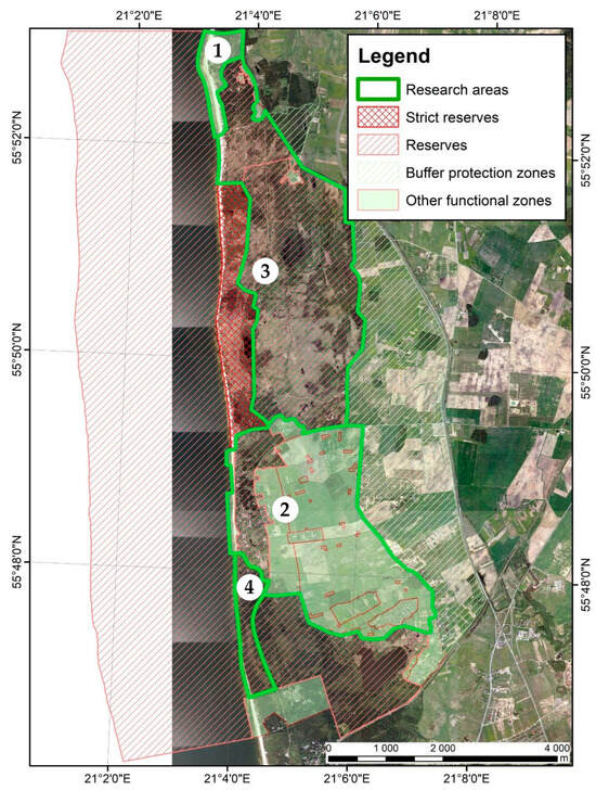 Our analysis focuses on Pajūris Regional Park (a Category V CMPA), a former military training ground converted to a Baltic Sea marine protected area (Figure 1). It is in the Baltic Sea coastal subregion of the Southeast Baltic Graded Coast [34]. A graded coast is a type of seacoast where the erosion of a promontory and eroded sediment deposition in adjacent bays tends to grade the shape of the coast [35,36].