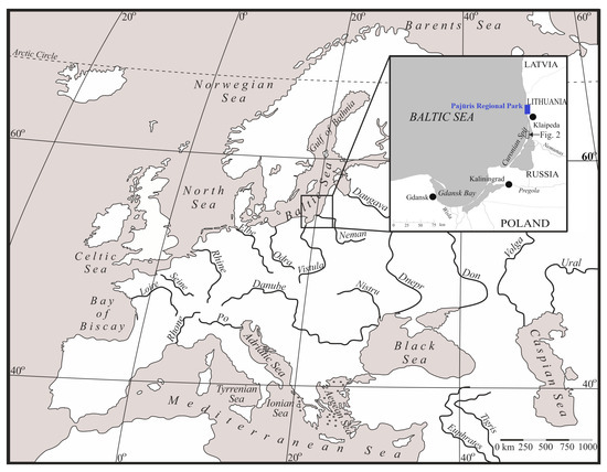 Southeast Baltic Graded Coast in Europe. Pajūris Regional Park is marked in blue.