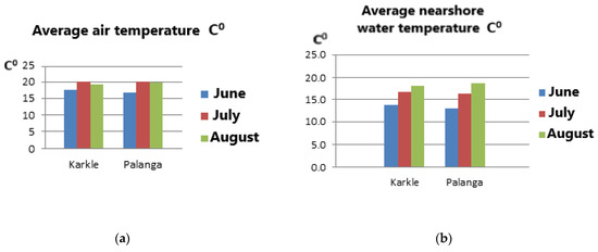Average climatic leisure amenities in Karklė and Palanga in June to August from 2010 to 2020: (a) Monthly air temperature (°C); (b) water temperature (°C).
