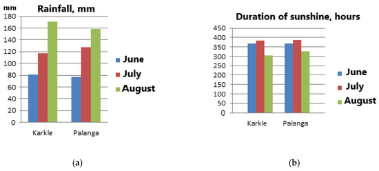 Average climatic leisure amenities in Karklė and Palanga in June to August from 2010 to 2020: (a) Monthly rainfall (mm); (b) duration of sunshine (hours).