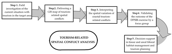 The overall methodological framework of our study relies on three interrelated tenets: (1) Highlighting the essential differences in sustainable tourism development and nature conservation between the linear habitats (beaches and other waterfront types) and the areal habitats (natural and semi-natural hinterland); (2) conjoining application of DPSIR and Delphi tools to elicit the key manifestations of these essential differences in the management of Pajūris Regional Park; and (3) interpreting the results of the analysis of tourism-related conflicts in linear and areal habitats of Pajūris Regional Park by applying GIS. Hence, the data collection and interpretation comprised five steps (Figure 5).