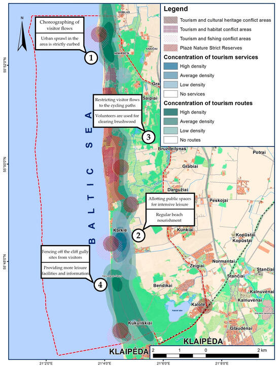 Figure 6 also shows that the starkest and most multifaceted tourism-related conflicts occur in Nemirseta (1) and Karklė (2) seaside resorts, where the concentration of visitors and the highest demand for tourism facilities. These two seaside resorts are prone to the most acute risk of coastal squeeze. Also, the highest concentration of tourist flows passing across Pajūris Regional Park occurs in Karklė and Nemirseta. Since access to Plazė Strict Nature Reserve for lay visitors is restricted to the bike path, the choreography of tourist flows in the park becomes complicated and requires special skills and dedication.
