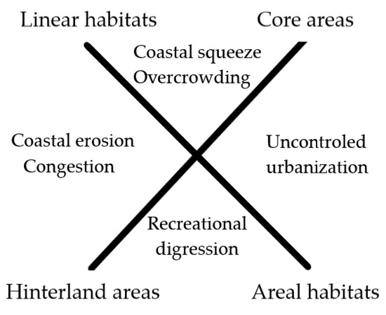 After the military use ended, the management of the converted coastal areas shifted from a prescriptive approach to a negotiation one, which emphasizes consensus-building with local stakeholders [33]. Local people started feeling a sense of ownership over the land and tourism, contrasting with the military management. However, multiple challenges remain. Hence, the central issue of the article is to identify the critical conditions for ensuring the competitiveness and sustainability of tourism in a former coastal military area converted to a CMPA. We argue that the main challenges in coastal and hinterland tourism stem from the differences between the system’s linear and areal littoral habitats.