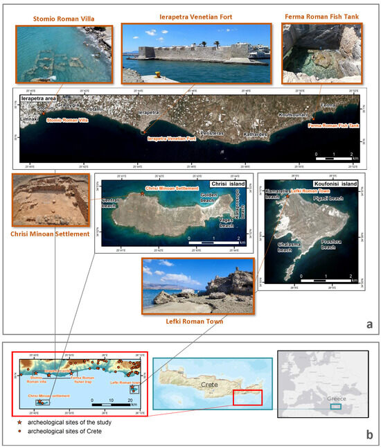 The island boasts a plethora of significant archaeological sites, reflecting its rich tangible heritage. Approximately thirty archaeological sites of various epochs are located in the southeastern region of Crete [2,53,54], however this study is focused on the five major ones (Figure 1).