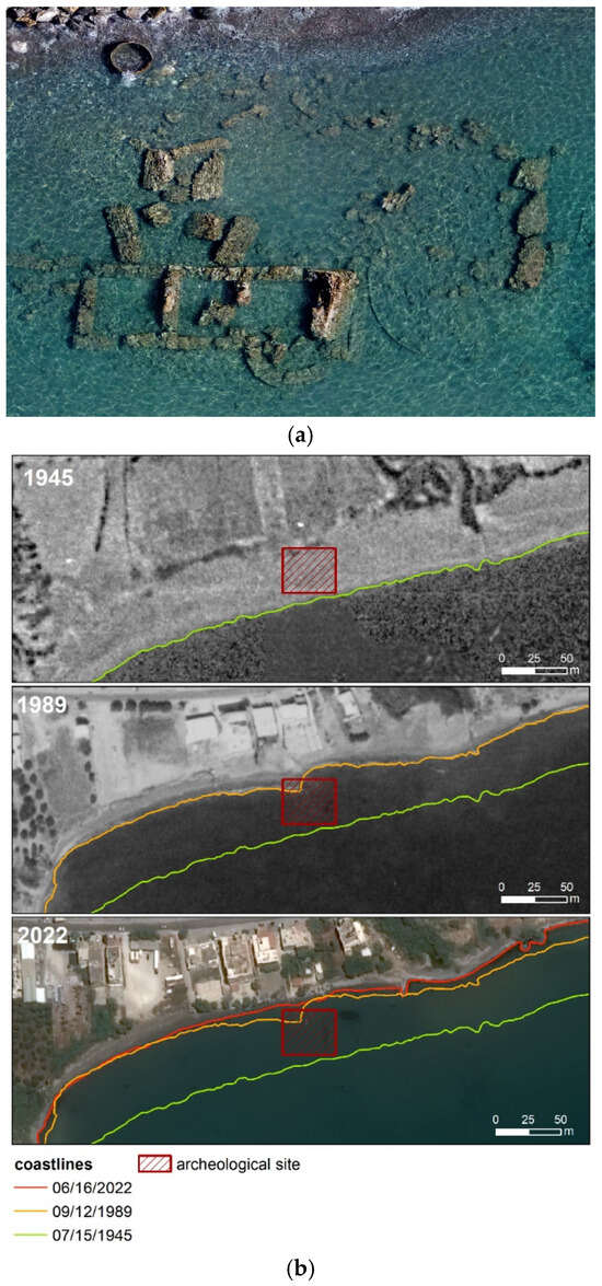 Coastal erosion in the area of Stomio Roman villa: (a) modern view from drone, 2023, (b) coastal dynamics from aerial/satellite images.