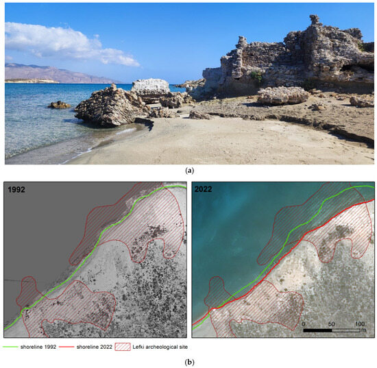 Archaeological site of Lefki on Koufonisi island: (a) field view, 2023, (b) coastal dynamics (on the left—orthophoto mosaic from aerial images of 1992, on the right—Pleiades image of 2022). The blue arrow shows the location of the photo (a) shooting.