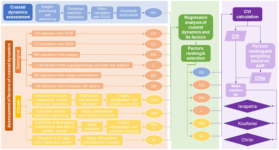 Flowchart of the methodology of the study. SH—rates of shoreline changes in previous years, CH—height of the cliff/beach, CS—coastal slope, BW—width of the beach, L—lithology, BR—presence of beachrock, GM—vertical ground motions, WS—average speed of winds from wave generating directions, WH—average significant waves heights, WWE—wind–wave effect, SL—sea-level changes.