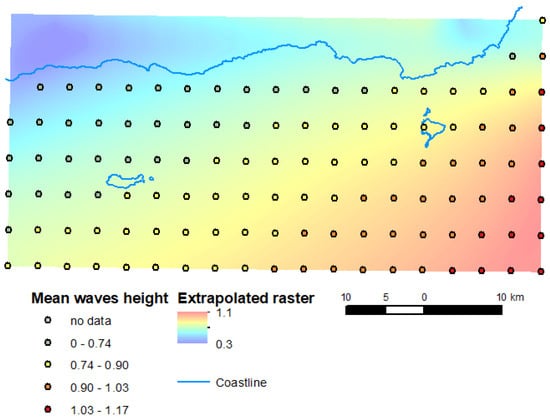 Average significant wave heights (WH) were calculated based on the data from the product ‘Mediterranean Sea Waves Reanalysis’ of the Copernicus Marine Service, containing the dataset of hourly wave parameters, covering the period from January 1993 until 1 month before the present, at 1/24° horizontal resolution [84]. Data for Southeastern Crete were extracted, processed, and averaged using Python (Version 2.7.18). After, the Kernel Interpolation With Barriers tool of ArcGIS 10.8 software was used to interpolate data from points to raster (Figure 6). From this raster, the values were then extracted to the points of coastal transects.
