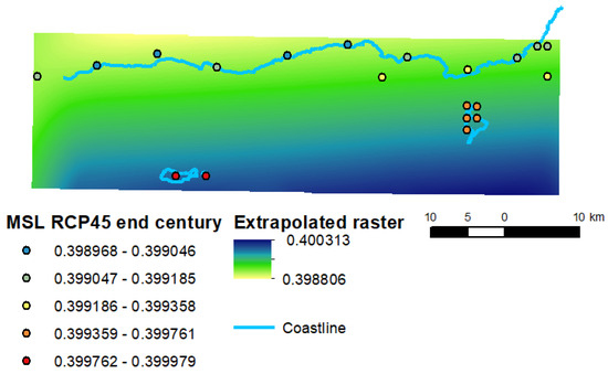 Sea-level change (SL) data were extracted from the ‘Water level changes in Europe’ product by Copernicus Climate Change Service [88]. The mean sea-level data projected for the end of the century was used, according to the RCP 4.5 scenario (as an intermediate scenario), which was modelled based on ERA5 Reanalysis (1979–2017) data. The data for Southeastern Crete were extracted from this dataset, processed, and averaged using Python. The Kernel Interpolation With Barriers tool of ArcGIS software was used to interpolate data from points into a raster (Figure 7), from which sea-level changes values were extracted to the points of coastal transects.