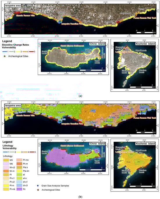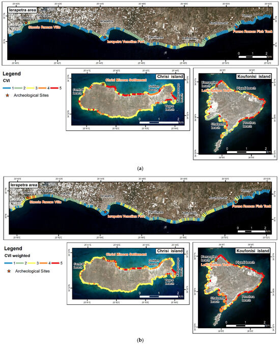 The purpose of the present research is to assess the vulnerability of archaeological sites of Southeastern Crete to coastal hazards. Following the Intergovernmental Panel on Climate Change definition [36], vulnerability is “the degree to which a system is susceptible to and unable to cope with adverse effects of climate change, including climate variability and extremes”. In this study, coastal vulnerability is defined as the susceptibility of coasts to erosion, considering only natural factors. Social and infrastructural factors were not included in the CVI calculation but were treated as elements exposed to erosion. The calculated CVI values were specifically applied to archaeological sites located within the study area’s coastal zone to assess the potential impact of coastal hazards on these cultural heritage sites. Additionally, weighting was performed based on the results of correlation of spatial distribution of the factors of coastal dynamics with historical shoreline changes.