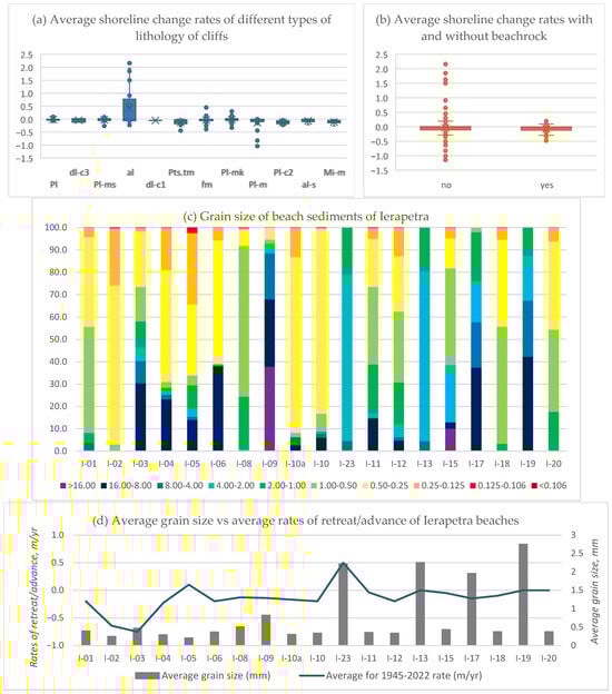 Additionally, during fieldwork conducted in the Ierapetra area, 19 sediment samples were collected from every beach of the area from the most representative segment of every beach (from the berm—the highest point of the beach, dividing foreshore and backshore). Grain-size analysis was performed at the Technical University of Crete using a standard sieving method with a mechanical sieve shaker, employing a series of mesh sizes ranging from 0.106 mm to 16 mm. Prior to sieving, the samples were air-dried to eliminate moisture content, and fines were removed through washing to ensure accurate results [78]. Grain size classification adhered to the Wentworth scale [79], which categorises sediments into gravel, sand, silt, and clay based on particle size. To establish a quantitative correlation with rates of retreat/advance, the average grain size of each sample was assessed by calculating volume, mass, and particle count for each sieve fraction.