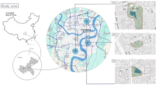 (a) Yugao Park: location, Jiulongpo District; area 5 hm2. (b) Nanhu Community Shuangyong Cultural Park: location, Southbank District; area, 1.31 hm2. (c) Wanqing Park: location, Yubei District; area, 0.96 hm2.