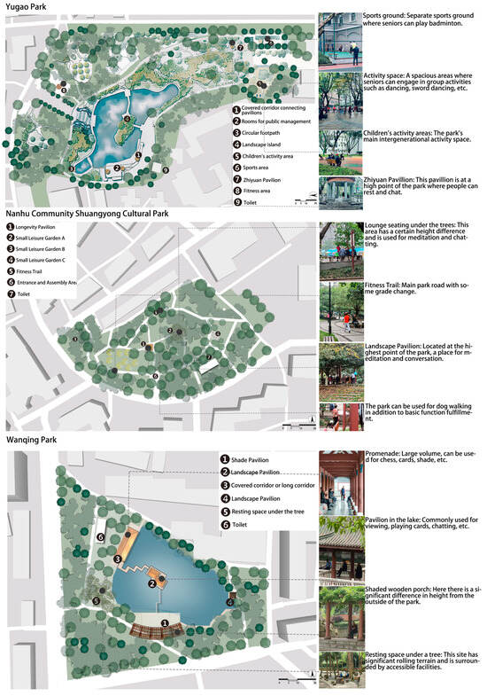 Based on field research conducted from 27 to 30 April 2024, three parks in urban renewal areas were selected for study (Table 1, Figure 1). Yugaogong Park (5 hectares) has a vertical elevation difference of up to 30 m and a maximum slope of 15%, incorporating age-friendly features such as fitness trails. Nanhu Shuangyong Park (1.31 hectares) creates pedestrian activity spaces through terrain with slopes ranging from 5% to 15%. Wanjing Park (0.96 hectares) takes advantage of a 10–30 m elevation difference to create natural activity interfaces. All three parks are situated in older communities with buildings over 15 years old, where more than 20% of residents are aged 60 and above. Field observations indicate that over 65% of park users are older adults. The spatial configurations of these parks include fitness trails, barrier-free facilities, rest nodes, and cultural amenities, supporting multifunctional activities such as walking, fitness, social interaction, and childcare (Figure 2).