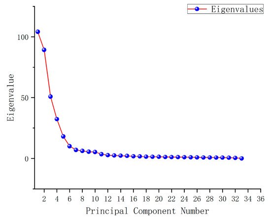 Based on the rotated component matrix, the first principal component (variance contribution of 26.37%) primarily encompasses five dimensions: spatial creation, sense of security, activities and fitness, social connections, and mobility. This component is referred to as “Park Spatial Activities and Social Connections (AS)”. The second component (variance contribution of 16.76%) includes five dimensions: accessibility, transportation convenience, public transport services, navigation and signage, and surrounding service facilities. We define it as “Park Accessibility and Surrounding Service Convenience (AC)”. The third component (variance contribution of 12.22%) consists of five dimensions: scenic views and shading, seasonal changes, natural connection, environmental maintenance, and landscape quality. We summarize it as “Landscape Environment and Natural Connection (EN)”. The fourth component (variance contribution of 10.82%) mainly involves four dimensions: infrastructure, comfort, accessibility and convenience, and management and cleanliness. This is defined as “Facility Maintenance and Accessibility Design (FB)”. The fifth component (variance contribution of 9.67%) contains two dimensions: respect and self-worth realization. This component is referred to as “Community Participation and Value Realization (PV)”. The sixth component (variance contribution of 6.62%) includes four dimensions: spiritual life, sense of belonging, cultural heritage, and intergenerational interaction. These are summarized as “Social and Cultural Exchange and Sense of Belonging (IS)”. Based on these components, the first six principal components (with a cumulative variance contribution of 82.45%) were extracted to construct predictive variables for subsequent analysis (Figure 4).