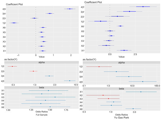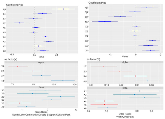 Based on raw data from three parks, we employed three regression models—ordered probit, multinomial logit, and ordered logit—using Stata MP 18.0. Model evaluation was conducted with indicators including −2log(Λ), Pseudo R2, p-value, Akaike Information Criterion (AIC), Bayesian Information Criterion (BIC), and Iteration Count. Among these, −2log(Λ), Pseudo R2, p-value, AIC, and BIC were used to assess model fit. As shown in Table 5, the ordered logit model outperformed the other two across multiple indicators, including −2log(Λ) (1059.655), Pseudo R2 (0.0978), p-value (0.000), AIC (1078.656), and BIC (1117.517). This indicates that the ordered logit model provides a more accurate representation of the data and is better suited for explaining the variables. The iteration count was used to evaluate computational efficiency, and the results showed that the ordered logit model converged in just three iterations, demonstrating its high efficiency. Consequently, the ordered logit model will be adopted in subsequent research to estimate the effects of predictor variables on the response variable [13].