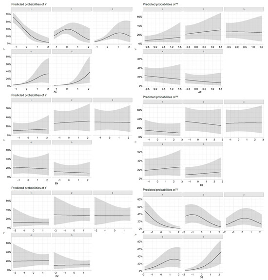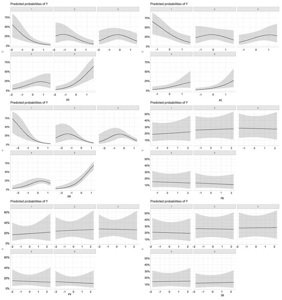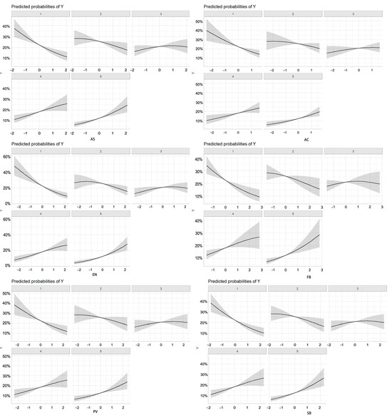 The distribution of coefficients and odds ratios for the full sample (Table 6, Figure 5) demonstrates that all six planning factors exert significant effects, ranked in descending order of impact strength as follows: FB > AS > AC > EN > SB > PV. Notable differences exist in satisfaction indices across various community park planning factors. Predictive analysis based on marginal effects further confirms the varying influence of different park planning and design elements. Overall, facility accessibility, spatial social connections, general accessibility, and landscape environment emerge as the primary determinants of older adults’ satisfaction. The marginal effect analysis for the full sample indicates that all six factors significantly and positively contribute to satisfaction, with each unit increase in an independent variable corresponding to a proportional rise in overall satisfaction levels. These findings suggest that, in high-density mountainous urban parks, the provision of accessible facilities, social and spatial connectivity, and a well-designed landscape environment universally enhances older adults’ satisfaction. Specifically, Yugao Park places greater emphasis on spatial activities and social interactions, while Nanhu Community Shuangyong Cultural Park exhibits a stronger influence of accessible facilities and landscape environment. Meanwhile, in Wanqing Park, improvements in accessibility, given the substantial topographical variations, have markedly enhanced satisfaction levels.