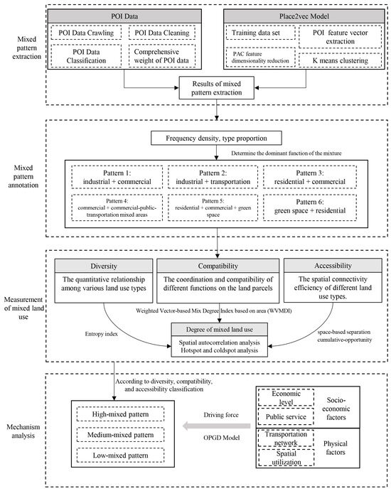 The research approach of this study is as follows: First, the Place2vec model is combined with POI data to extract urban mixed functional patterns. Then, based on the extracted mixed functional patterns, the degree of MLU under different patterns is quantified and measured by integrating the three dimensions of diversity, compatibility, and accessibility. Finally, an in-depth mechanism analysis is conducted on the spatial patterns of the degree of mixed land use under different patterns.