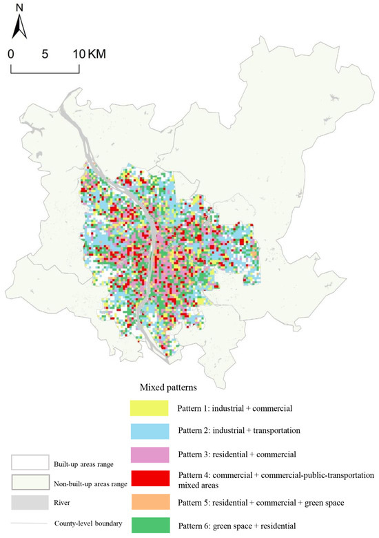 By combining the Place2vec model with POI data, this study obtained the mixed land-use functional patterns in the built-up areas of Changsha, dividing the grids into six cluster regions, which represent six types of mixed patterns (Figure 3). Based on the calculation results of frequency density and type proportion for each grid, the six mixed patterns were labeled. Each cluster region encompasses diverse urban functional types, with the top two functional zones with the highest proportion in each cluster serving as the classification criteria (Table 4).