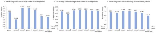 Pattern 3 (residential + commercial), pattern 4 (commercial + commercial-public-transportation mixed areas), and pattern 5 (residential + commercial + green space) demonstrate superior accessibility, with average accessibility values of 0.204, 0.201, and 0.195, respectively (Figure 4). These three patterns are predominantly distributed in the urban cores and around commercial centers, where the balanced and extensive distribution of functional facilities reduces commute distances and time costs, thereby enhancing regional accessibility. In contrast, pattern 1 (industrial + commercial) exhibits moderate accessibility, with an average accessibility value of 0.189. This pattern includes a small amount of industrial land, and the dispersed layout of industrial areas may limit the reach of commercial services, reducing their service efficiency and consequently affecting accessibility. The poorest accessibility is observed in pattern 6 (green space + residential) and pattern 2 (industrial + transportation), with average accessibility values of 0.182 and 0.179, respectively. This may be attributed to the fact that green spaces and residential areas are primarily single-function oriented, while the exclusivity of functions in industrial parks and zones reduces the appeal of the surrounding areas to service facilities. As a result, the spatial agglomeration effect of various facilities is insufficient. Furthermore, these two patterns are mainly located on the outskirts of the city, where service functions are sparse and spatially dispersed. This limits the connectivity of facilities and the coverage of services, ultimately impacting overall accessibility.
