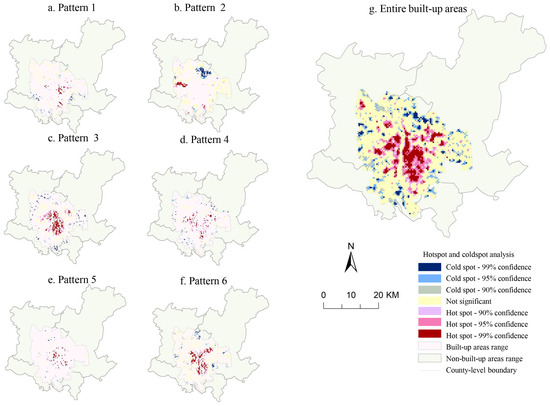 Spatial autocorrelation analysis and cold–hot spot analysis were conducted on the MLU across the entire built-up areas of Changsha and under six specific patterns (Figure 5). The results indicate that the MLU exhibits significant positive spatial autocorrelation, demonstrating spatial clustering characteristics. From a holistic spatial pattern perspective, the cold and hot spots of the degree of MLU exhibit a pronounced center–periphery structure. Specifically, hot spots form high-value clusters along the Xiang River in the urban core areas, while cold spots display fragmented and dispersed spatial characteristics in the urban periphery. Specifically, in pattern 1 (industrial + commercial), hot-spot clusters are mainly located near Martyrs’ Park and the Gaoqiao Market area, with cold-spot clusters concentrated in the Huangxing Town area. In pattern 2 (industrial + transportation), hot-spot clusters are distributed in the Lugu area, Sany Heavy Industry Industrial Park, and Zhanggongling, while cold-spot clusters are found in the vicinity of Wujialing and the surroundings of the Sizhou Ancient Temple. Pattern 3 (residential + commercial) forms multiple hot-spot clusters, primarily around the Changsha County Government, Beichen Delta, Sanxiang community, and Shazitang neighborhood, with cold-spot clusters mainly in the Nantuo subdistrict. Pattern 4 (commercial + commercial–public–transportation mixed areas) exhibited distinct clustering characteristics, with hot spots concentrated near the Wanjiali Plaza, the Xingsha Cultural Park, and the Red Star International Convention Center, while cold spots aggregated in the Taohua Village and the Hanpu District. Pattern 5 (residential + commercial + green space) features hot-spot clusters mainly in the Chaozong Street area and Shawan Park, and the cold-spot clusters are primarily concentrated near Huanghua Airport. Pattern 6 (green space + residential) has a higher number of hot-spot clusters, distributed around the Yuelu District Government, the Jiufeng District, and the Railway Campus, while cold-spot areas are scattered in the outer urban regions. It can be concluded that hot-spot areas of MLU generally coincide with urban commercial, residential, and public service facilities, whereas cold-spot areas are often located at the urban fringe or in functionally homogeneous zones, reflecting that high-density development in the core area facilitates a positive feedback effect on the functional mixture, whereas low-density sprawl in the periphery induces a spatial lock-in effect of functional homogenization.