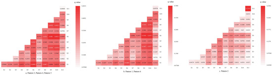 According to the interaction detection results of the geo-detector (Figure 6), the MLU in the built-up areas of Changsha is influenced by the interactions of multiple factors. Overall, the q-values of most factor interactions have increased. Among them, the strongest interacting factor combination for pattern 3 (residential + commercial), pattern 4 (commercial + commercial–public–transportation mixed areas), and pattern 5 (residential + commercial + green space) is the closest distance to a bus station (X6) and the floor area ratio (X10), with a post-interaction q-value of 0.491. Another strong interacting factor combination is the closest distance to a bus station (X6) and the building density (X9), with a q-value of 0.488. For pattern 1 (industrial + commercial) and pattern 6 (green space + residential), the strongest interacting factor combination is the closest distance to a bus station (X6) and the floor area ratio (X10), with a post-interaction q-value of 0.398, and another strong interacting factor combination is also the closest distance to a bus station (X6) and building density (X9), with a q-value of 0.393. For pattern 2 (industrial + transportation), the strongest interacting factor combination is the closest distance to a bus station (X6) and the closest distance to a metro station (X5), with a q-value of 0.181. This indicates that spatial utilization and transportation network development are the main factors influencing MLU in the built-up areas of Changsha.