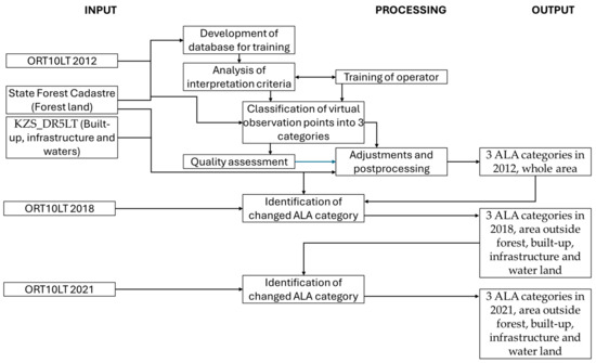 First, a detailed mapping of abandoned agricultural land was conducted. Abandoned agricultural land was identified across Jonava Municipality using a 25 × 25 m grid, which aligns with the network of virtual observation points currently being developed by the Lithuanian National Forest Inventory (NFI) for greenhouse gas accounting in the LULUCF sector (Figure 1b). The ALA status was determined manually by analysing a digital raster orthophoto map of the Republic of Lithuania (ORT10LT) at a scale of 1:10,000 (https://www.geoportal.lt/arcgis/rest/services/NZT/ORT10LT_2012_2013/MapServer, accessed on 12 April 2025), following the ALA definition of Law on Land Tax [41], with areas of agricultural land overgrown with woody plants classified as abandoned. The analysis was based on aerial images acquired in 2012, 2018, and 2021. The methodological framework for the identification of ALA is summarized in Figure 2. The process began with the identification of virtual observation points overgrown with woody vegetation. Subsequently, areas outside the scope of the current study—such as forests, built-up areas, infrastructure, water bodies, orchards, and plantations—were excluded. The remaining areas, primarily agricultural lands, were classified into three categories based on the location of the virtual observation point relative to a contiguous polygon of at least 0.1 ha overgrown with woody vegetation, i.e., “abandoned”, “not abandoned”, and “other”. The “other” category typically included areas covered by tree and brush vegetation located outside, but adjacent to, forest land—such as along roads or in similar settings—and usually pertaining to the precision of forest edge delineation. Changes in ALA status were only identified for subsequent dates, specifically 2018 and 2021. Interpretation was carried out by an experienced land management expert following an aerial photo interpretation methodology adapted from forest inventories [51].
