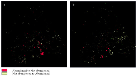Development of agricultural land abandonment during the period of 2012–2018 (a) and 2018–2021 (b).