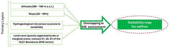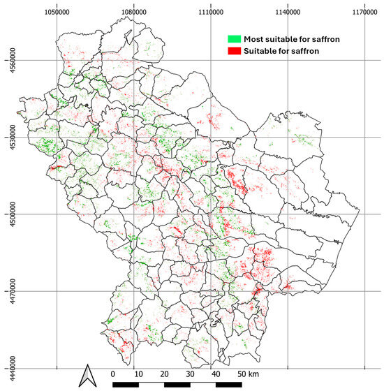 Once we defined the different suitable layers for saffron cultivation, the final suitability map was built by overlapping these strata (Figure 6). Lastly, by adopting municipal boundaries and the grain size layers, we obtained the extent of suitable areas at a municipal level and the subset of areas considered most suitable for saffron cultivation due to the optimal soil texture, respectively. The GIS environment adopted for the collection, management, and analysis of all the layers is Quantum GIS (QGIS) (3.28.5 version, available at http://qgis.osgeo.org, last accessed on 10 April 2025).