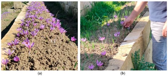 The first noteworthy result of growing saffron in tuff tubs lies in facilitating and increasing the recovery of floral bioresidues, thus guaranteeing a better quali-quantitative production, according to the results obtained by Cicco [48], through the use of big plastic pots. At the same time, workers involved in agronomic practices can assume an ergonomic posture without jeopardizing the production of flowers and corms (Figure 7). In fact, saffron cultivation in tuff tubs offers the possibility of working both standing and seated. The collected data of the experimental area were compared with those reported in the literature [84].
