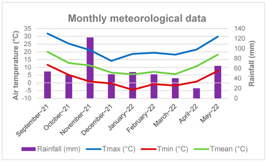 - Meteorological data of the Tricarico station (from the Decentralized Functional Center of Civil Protection of Basilicata Region, see http://www.centrofunzionalebasilicata.it, last accessed on 10 April 2025) were acquired and collected to characterize the environmental conditions of the experimental area. These meteorological data include monthly precipitation and mean, maximum, and minimum air temperature collected during the vegetative period of saffron (September 2021–May 2022);