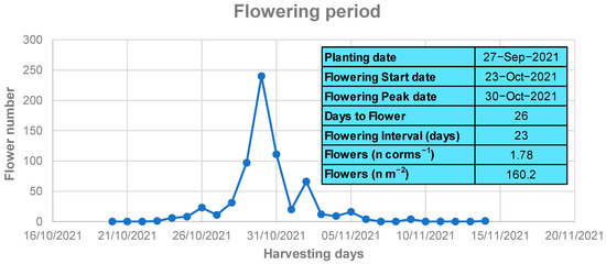 To evaluate the effectiveness of the proposed cultivation system, the number of flowers, number of daughter corms per mother corm, and daughter corms with horizontal diameters belonging to different size classes, as well as the average leaf length per plant were recorded. Figure 9 shows the flowering period in 2021 in Tricarico and the most representative flowering data from the experimental trial. The parameters investigated are generally influenced by pedoclimatic conditions. However, values concerning the number of flowers per corm (diameter 3–3.5 cm) and flowers per square meter are fully within the average data reported in literature [84] for the traditional saffron cropping system.