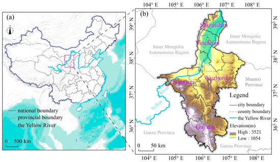 Geographical context of the study area: (a) national territorial boundaries of the People’s Republic of China; (b) location and administrative divisions of Ningxia Hui Autonomous Region. Note: The base map of China was derived from the Standard Map Service of the National Administration of Surveying, Mapping, and Geoinformation (Approval No. GS (2019) 1815) without modification.