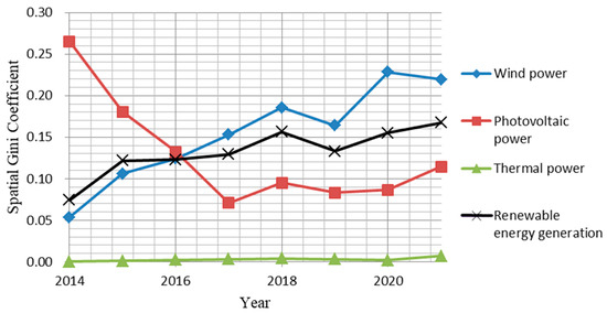 where Pi is the renewable energy generation of province i, and Qi is the total power generation of province i. The spatial Gini coefficient ranges from 0 to 1. A higher Gini coefficient indicates a higher degree of spatial agglomeration in renewable energy production, while a lower coefficient indicates a more uniform spatial distribution.