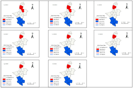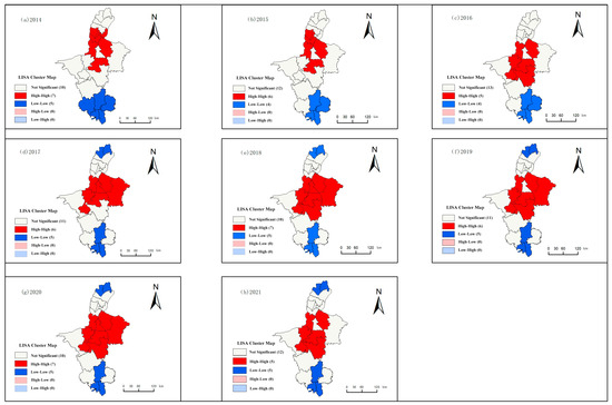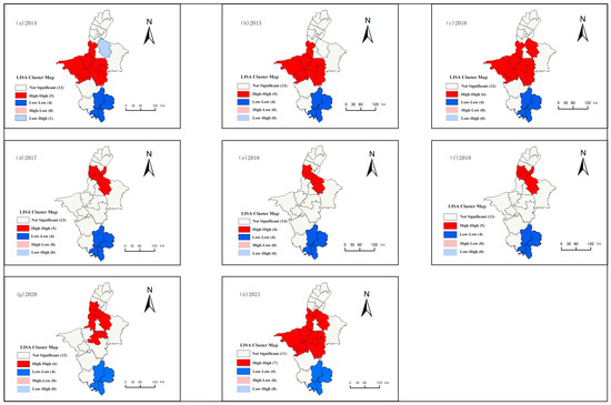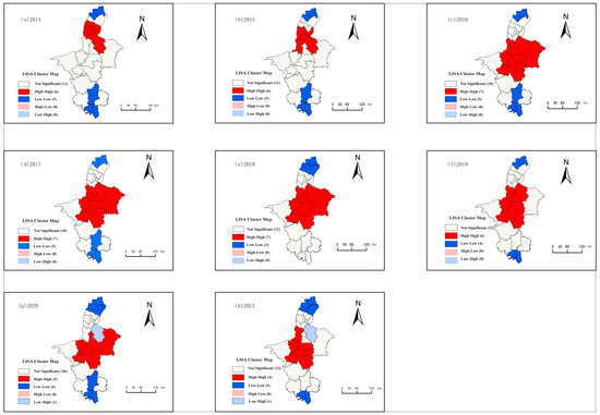 Using ArcGIS 10.8, the global Moran’s indices for the total renewable energy production and its components in Ningxia from 2014 to 2021 were calculated (Table 2). The global Moran’s indices for 2014–2021 were all greater than 0 and passed the 1% significance test, indicating significant spatial positive correlation and obvious spatial agglomeration characteristics for all types of renewable energy production in Ningxia. The average global Moran’s I indices for total renewable energy generation, wind power, and photovoltaic power were 0.796, 0.771, and 0.779, respectively, with the spatial autocorrelation of total renewable energy generation being the most significant. This spatial interdependence and correlation further strengthened the spatial agglomeration effect of renewable energy production.