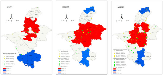 Using the 91 Satellite Map, remote sensing images of Ningxia for three key years (2014, 2018, and 2021) were downloaded, with a spatial resolution of 3 m. The specific geographic locations of photovoltaic and wind power plants were identified and mapped, and their coverage areas were estimated. ArcGIS was employed to overlay the spatial layout of renewable energy power plants with the LISA maps of total renewable energy generation (Figure 7). This coupling analysis aimed to explore the spatiotemporal evolution patterns of renewable energy production in Ningxia.