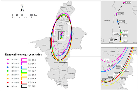SDE of total renewable energy generation in Ningxia. Note: Colors represent different years; the upper right shows the movement of the SDE center of gravity, and the lower right shows SDE boundary shifts. Source: author’s calculations.