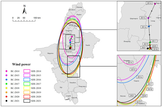 SDE of wind power generation in Ningxia. Note: Colors represent different years; the upper right shows the movement of the SDE center of gravity, and the lower right shows SDE boundary shifts. Source: author’s calculations.