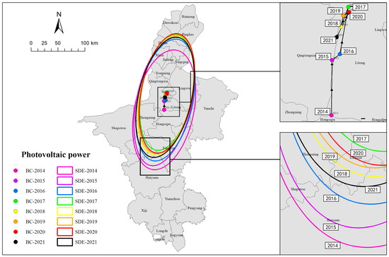 SDE of photovoltaic power generation in Ningxia. Note: Colors represent different years; the upper right shows the movement of the SDE center of gravity, and the lower right shows SDE boundary shifts. Source: author’s calculations.