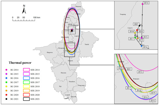 SDE of thermal power generation in Ningxia. Note: Colors represent different years; the upper right shows the movement of the SDE center of gravity, and the lower right shows SDE boundary shifts. Source: author’s calculations.