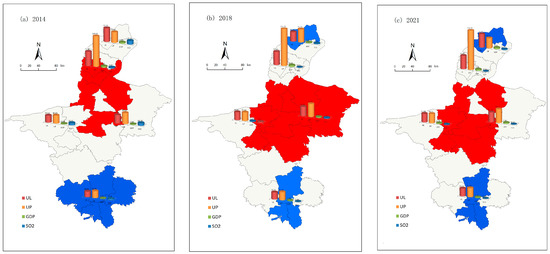 To further validate the spatial agglomeration characteristics of renewable energy and their relationship with urbanization, population–economy scale, and environmental pollution, we constructed bar charts using growth rate data for urbanization level, urban population, per capita GDP, and industrial SO2 emissions in 2014, 2018, and 2021. These charts were overlaid with LISA maps of renewable energy generation (Figure 12), visualizing trends and regional disparities in socioeconomic and environmental indicators.