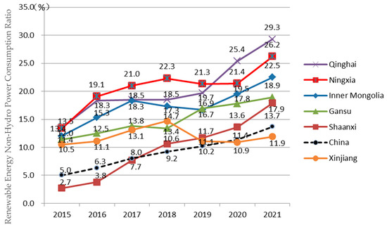 In July 2012, the National Energy Administration officially designated Ningxia as China’s first national comprehensive demonstration zone for new energy [67]. This milestone not only revitalized the development of Ningxia’s new energy industry but also marked a new phase of growth in renewable energy. The renewable energy non-hydro power consumption ratio (i.e., the proportion of renewable energy in total electricity consumption) reflects the development level of renewable energy and its contribution to regional green and low-carbon energy transitions. To further analyze the spatiotemporal characteristics and influencing factors of renewable energy production in Ningxia from 2014 to 2021, this study compared Ningxia with neighboring provinces (autonomous regions) in Northwest China—Qinghai, Gansu, Inner Mongolia, Shaanxi, and Xingjiang—as well as national clean energy demonstration zones using renewable energy non-hydro power consumption ratios from 2015 to 2021 [68] (2015 marks the first year of China’s annual renewable energy development monitoring and evaluation reports) (Figure 13).