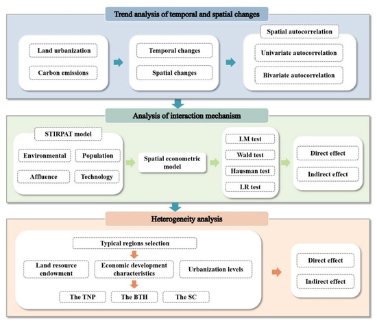 The Hu Line functions as the most prominent geographical demarcation in China, with the population density on its eastern side significantly higher than that on its western side. In recent years, the levels of economic development and urbanization in the eastern region have shown marked disparities compared to those in the western regions [51]. Although some scholars have explored the relationship between urbanization and CEs based on the urban agglomerations in the regions east of the Hu Line [42], they measure urbanization by a composite indicator of population, land, and economy, which makes it difficult to directly and accurately identify the specific causal relationship between the various elements of urbanization and CEs, especially LU. Furthermore, the analysis exclusively utilized data from 2000, 2010, and 2020 for analysis, focusing solely on the relationships between the variables in those specific years. Hence, the primary contributions of this study are summarized below: Firstly, this study adopts LU as an entry point and employs the STIRPAT model in conjunction with spatial econometric models. By utilizing panel data from prefecture-level cities spanning 2010 to 2019, it comprehensively examines both the direct and indirect spillover effects of LU on CEs. Secondly, this study focuses on the selection of 209 prefecture-level cities situated in the east of the Hu Line, an area characterized by high levels of urbanization and economic development in China, as the research region. Thirdly, based on factors such as land resource endowment, regional economic development features, and urbanization level, this study selects the Three Northeast Provinces region (TNP), the Beijing–Tianjin–Hebei region (BTH), and the Southeast Coastal region (SC) for regional heterogeneity analysis. This research aims to elucidate the mechanism underlying the interaction between LU and CEs, thereby facilitating the formulation of differentiated carbon emission reduction policies tailored to specific regions. Figure 1 is the research content frame diagram.