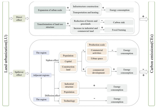 LU is a critical component of the urbanization process, characterized by the expansion of urban built-up areas and a continuous increase in urban construction land. Given the mobility of factors among cities and the spatial interdependence of CEs, theoretically, the impact of LU on CEs includes both direct effects and indirect effects. The direct effect reflects the influence of LU within a local region on CEs in the same region. The indirect effect, also referred to as the spatial spillover effect, represents the impact of LU in one region on the CEs of adjacent regions. Figure 2 is the mechanism analysis diagram.