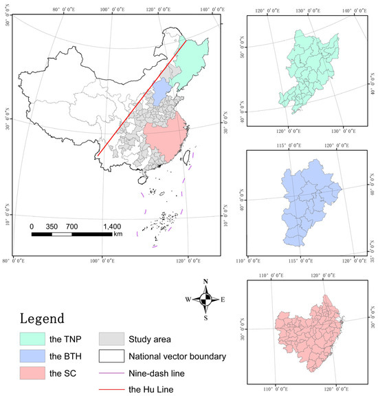 Given that this study primarily investigates the mechanism by which LU impacts CEs, it is particularly significant to focus on urban areas with a higher degree of urbanization. The Hu Line stretches diagonally from Tengchong in Yunnan Province to Heihe (Aihui) in Heilongjiang Province at a 45-degree angle [56]. The eastern area of the Hu Line demonstrates remarkable development and falls within the category of highly urbanized regions, whereas the urbanization level in the western area is comparatively lower [57]. Notably, CEs associated with construction land in the region east of the Hu Line are significantly higher than those in the western region [58]. Consequently, it is crucial to examine the influence of LU in the eastern region on CEs. Among the cities divided by the Hu Line, those with eastern regions comprising more than half of their total area were retained. The retained city boundaries remain intact, ensuring the validity and reliability of the empirical analysis results. There are a total of 292 prefecture-level cities in the east of the Hu Line. Owing to challenges in acquiring continuous carbon emission data for certain cities, this study ultimately selected 209 prefecture-level cities as the research area (Figure 3). Furthermore, the TNP, the BTH, and the SC will be selected for in-depth comparative analysis. These three regions, located in the northeast, central, and southeast of China, are representative in terms of land resource endowment, regional economic development characteristics, and urbanization levels. The TNP, which is dominated by heavy industry, has faced significant challenges in industrial transformation in recent years but retains ample potential for urban expansion. The BTH focuses on high-tech innovation and high-end service industries, demonstrating a robust trend of industrial synergy within the region, while urban expansion is subject to stringent planning controls. The SC has witnessed rapid growth in manufacturing and modern service industries, such as finance and trade; however, its urban expansion is constrained by limited available space. Consequently, the impact of LU on CEs varies across regions with distinct characteristics. The three regions comprise 35, 13, and 75 prefecture-level cities, respectively, accounting for 45.5% of the total number of prefecture-level cities in the east of the Hu Line. Moreover, their combined GDP constitutes 65% of the total GDP in this region.