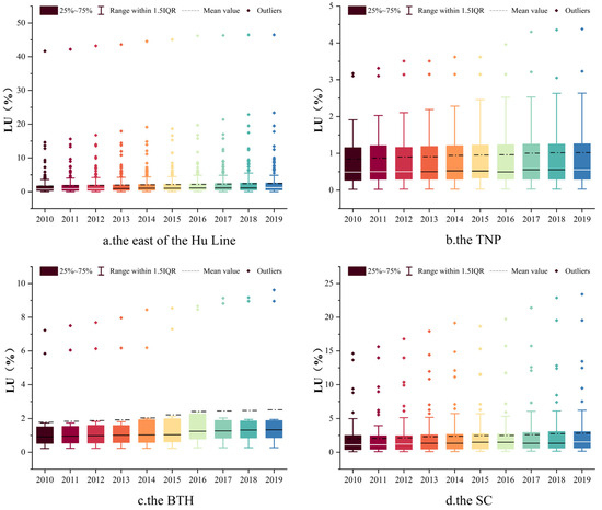 The temporal trend of LU from 2010 to 2019 is depicted in the box plots presented in Figure 4. The mean value of LU in the east of the Hu Line increased from 1.711% to 2.435%, corresponding to an average annual growth rate of 4.3%. The mean value of LU in the total TNP increased from 0.847% to 1.021%, with an average annual growth rate of 2.1% and minimal variation. The mean value of LU increased from 1.780% to 2.522% in the BTH and from 1.996% to 2.834% in the SC. Despite the relatively low mean value of LU, the presence of outliers indicated that LU values range from 5% to 50% in some cities, mostly located in the BTH and the SC.