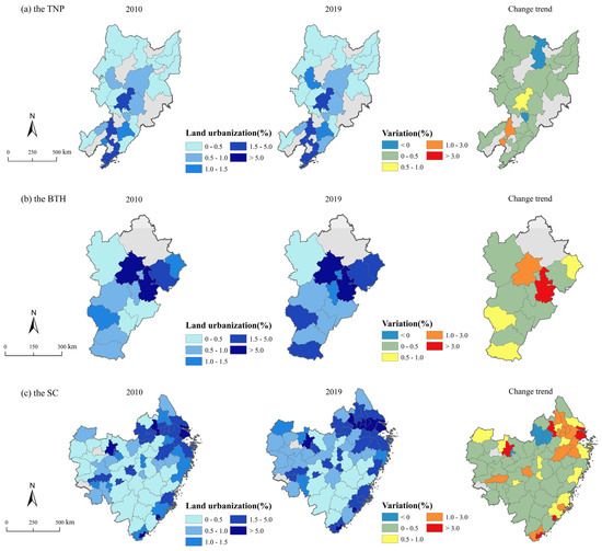 LU values exhibit a spatial distribution pattern characterized by higher levels in the central regions and lower levels in the northern and southern regions from 2010 to 2019 (Figure 5). Only 11 cities experienced a decline in LU, primarily concentrated in the Northeast area. LU exhibits a distribution pattern characterized by high values in central cities that radiate outward to surrounding areas in the TNP and the BTH (Figure 6). In contrast, in the SC, LU demonstrates a spatial distribution trend of gradually decreasing from the eastern coastal areas to the western inland areas. The areas with a decline in LU in the TNP include Yichun and Liaoyuan City. In the BTH, Beijing and Tianjin, both municipalities directly under the Central Government, serve as high-value centers for LU, while the remaining areas experience a slight increase trend. The growth rate of LU in coastal cities has been significantly accelerated, forming a distinct high-value concentration zone.
