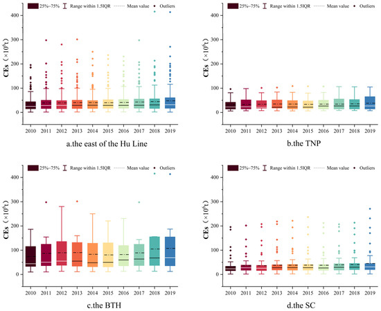 The mean value of CEs in the east of the Hu line increased from 35 × 106 t to 48 × 106 t from 2010 to 2019, with an average annual increase of 3.5% (Figure 7). In the BTH, CEs is significantly higher than that of the other two regions. Over the study period, it exhibited a trend of fluctuation and increase. In 2015, it slightly declined to 80.4 × 106 t, and reached its peak again in 2019, standing at 108 × 106 t. By contrast, in the TNP and the SC, CEs showed relatively gentle growth trends and both reached high values in 2019, at 38.1 × 106 t and 45.3 × 106 t, respectively.